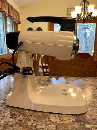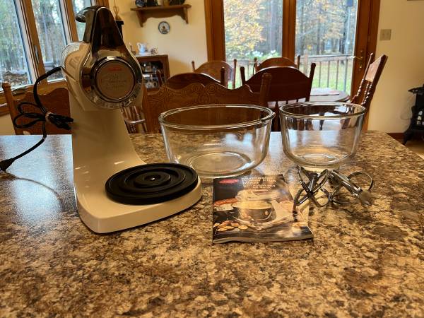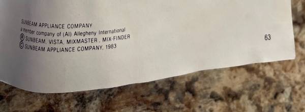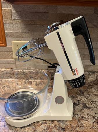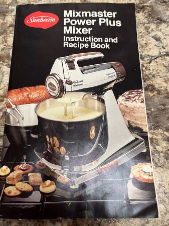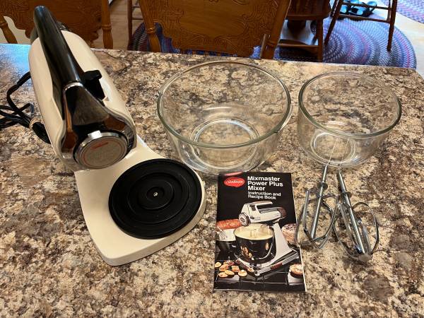 WORKS GREAT - 1983 Sunbeam Mixmaster Stand Mixer Model 01960. Beige color and two sturdy glass bowls. With 12 speeds and detachable parts, this mixer is perfect for whipping, blending, and beating tasks in the kitchen. It has a high-speed functionality and an additional mixing bowl included, making it a versatile and essential addition to any kitchen collecting. 69 page user manual/recipe booklet. One set up beaters....see video.