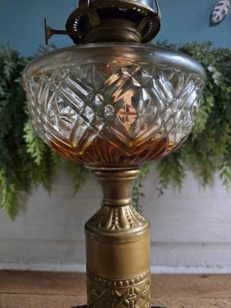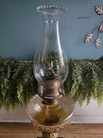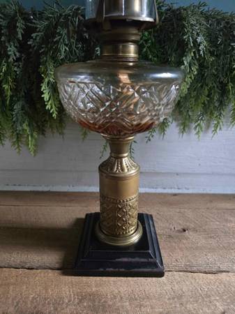 Price is firm. Antique oil lamp that measures 20.5" high. There is wear to the finish of the base as shown in the close ups.