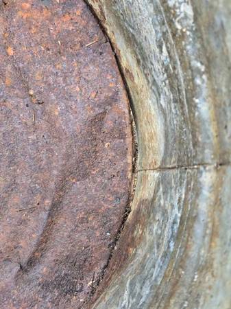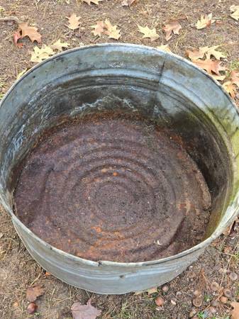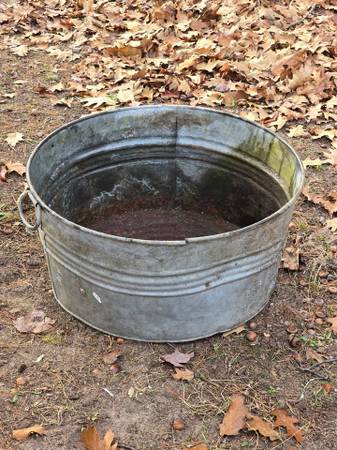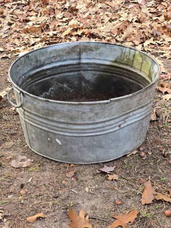Vintage galvanized 22" wash tub. It was used outdoors as a planter so it has dents, rust, marks, staining, and one side of the bottom has detached from the side. Please see all pictures.