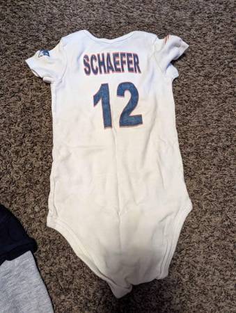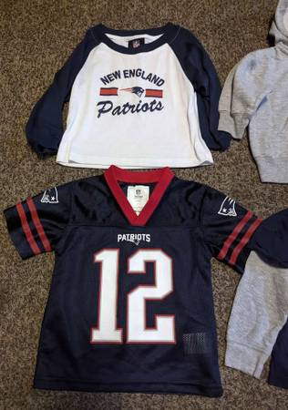Price is firm. Will not separate. Five-piece New England Patriots infant and toddler clothing lot. It includes one 18 month bodysuit, one 18 month hoodie, one 2T jersey, one 2T long sleeve shirt, and one 3T long sleeve shirt. The bodysuit has yellowed a bit over time and says "Schaefer," on the back. The rest are in gently used condition.