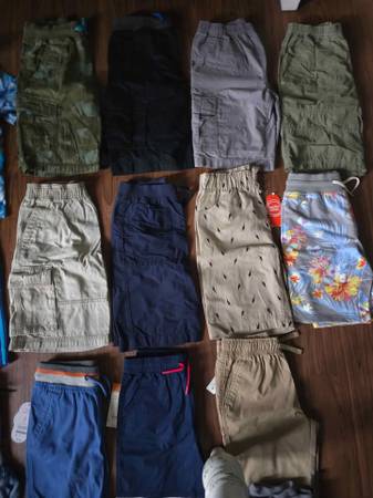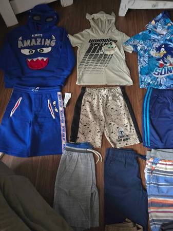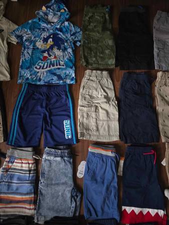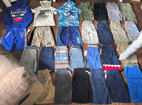 Price is firm. Will not separate. Large 22-piece bundle of boys clothes size 8. It includes 16 pair of shorts and 3 matching hooded sets of Star Wars the Mandalorian Grogu, Sonic the Hedgehog, and monster. 14 are new with tags. The Grogu top has two minor marker spots. The rest are in good gently used condition.