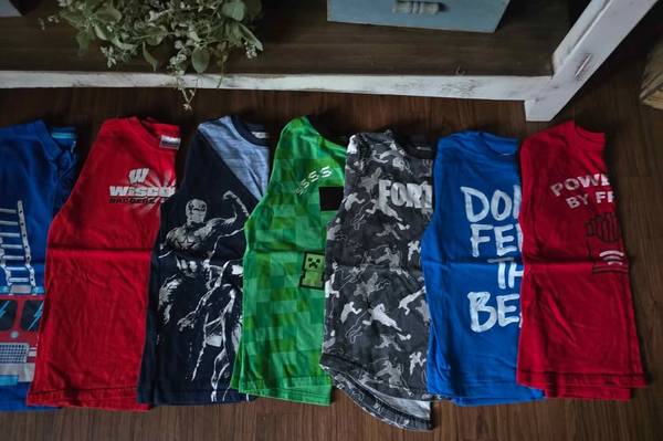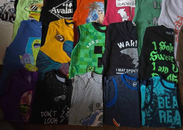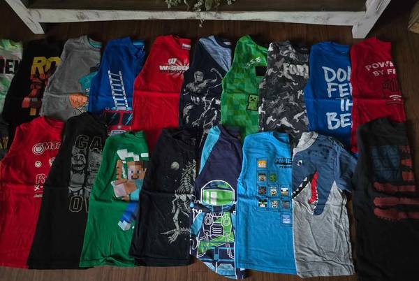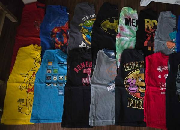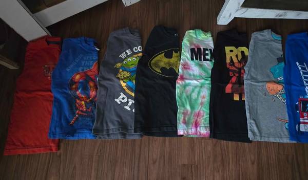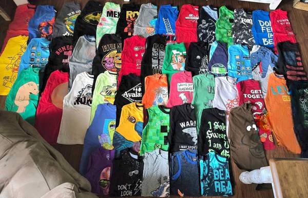 Price is firm. Will not separate. Large 54-piece bundle of boys size 8 M shirts with funny sayings or images from video games, movies, and TV shows. 42 are short sleeve and 7 are tank tops. There are a few that have a bit more wear from the wash, but the majority are in gently used condition. Three are new with tags.