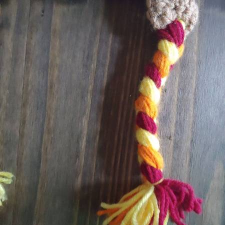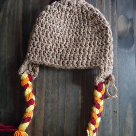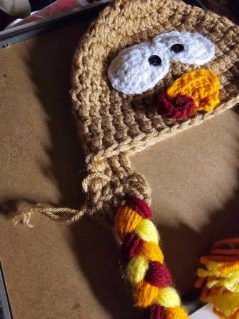 Cute handmade crochet turkey Thanksgiving hat one size toddler. At one flap the yarn is unraveling a bit. I am not sure if this can be fixed or not. Please see close ups. It is in gently used...