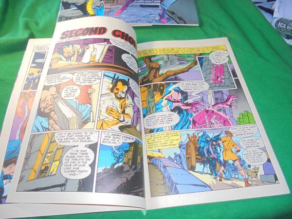3 - Sept. 1985 - "How Many Times Can A Guy Die? Part 3!" While inhabiting Pete, a circus helper, Deadman discovers that the Eagle is using his acrobatic talents by staging jewel heists from skyscraper offices! Unforunately, Deadman (in Pete's body) is discovered, and Eagle's gang chases him onto a Ferris wheel. Eagle and Deadman (still as Pete) have a deadly hand-to-hand fight that climaxes with Eagle throwing Pete from the top car. Deadman quickly enters Tiny's body, who is below, and uses it to catch Pete safely! Eagle and his gang are arrested by the police, who arrive just in time to save Tiny, Pete, Lorna, and other circus people from being shot to death by Eagle's henchmen. While talking with a policeman, Deadman (in Tiny's body) learns that Eagle staged another robbery on the West Coast on September 10th. Since that was the day he was shot, Deadman knows that Eagle cannot be his killer...! "Second Choice Part 2 " Continuesof this saga a young peasant man, Henry Lansbury, recruited another to defeat the Black Wizard terrorizing his village. This tale ponders the outcome had our hero confronted the evil tyrant himself! "Hide and Seek" Deadman seeks to learn what has happened to the police detective assigned to his case. He discovers that the detective, Michael Riley, has been falsely accused of brutally beating a thief who had already surrendered to him, and has been kicked off the force. Deadman, learning the accusers were ex-boxer Peter Bones and a hook-handed man named "Roy Martin", suspects Martin of being the Hook and staging the frame-up to get Riley off his trail. Deadman enters Riley's body, confronts Bones, and learns that the ex-pugilist agreed to give false testimony along with "Martin/Hook" in exchange for money to buy feed for his pet pigeons, the only companions he has left. Deadman/Riley leaves to phone the police to pick up Bones and to apprehend the Hook, who is still living nearby. But in the interim, the Hook beats Bones to death with a crowbar and flees. A travel folder for Mexico found in the Hook's apartment indicates his destination is Mexico. Riley is restored to his post as police detective, but Deadman has once again failed to find his killer!