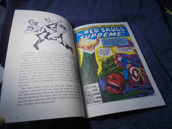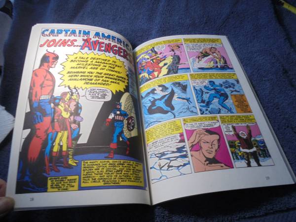 "Captain America Joins... The Avengers!" by Stan Lee, Jack Kirby, George Roussos and Artie Simek reprints the legendary Avengers #4 (March 1964), as Prince Namor, The Sub-Mariner, attacks a group of Eskimos and throws their idol into the sea. When the ice melts, the figure trapped within turns out to be Captain America, who was in suspended animation since the end of World War II. The Avengers rescue Cap and return to New York. An alien figure turns our heroes to stone. When Cap and Rick Jones track him down, the alien agrees to restore the Avengers if they agree to help him recover his broken spaceship in return. When doing so, the Avengers are attacked by Namor and his people. The restored spaceship ultimately drives off Namor and his Army!