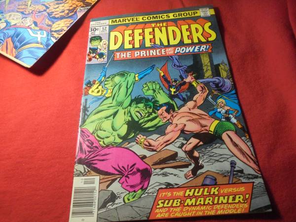 52 – Oct. 1977 – NM-! “Defender of The Realm!” by David A. Kraft, Keith Giffen and Chic Stone! Prince Namor, the Sub-Mariner, strides down Park Avenue in New York, causing great consternation among the citizenry, as no one knows his intentions! The Hulk spies him from the top of a nearby building and leaps down to offer his help, but Namor, in no mood for nonsense, swats him away and thus enraging Hulk who starts throwing punches while all witnesses flee!! In Russia, Dr. Tania Belinsky becomes the new Red Guardian in a most bizarre way! Patsy Walker, as Hellcat and Nighthawk they race to the scene as Namor shows he can discharge electricity like the eel (last done in FF #6) on The Hulk! The FF and Avengers are out of town and Peter Parker is stuck in the crowd, as the two beings pummel each other! Namor finally reveals that Radioactive leakage from Soviet underground nuclear tests has contaminated a portion of Atlantis, rendering it too dangerous to enter. Kyle suggests that Hulk could enter the contaminated zone safely and the big green guy agrees and they depart!