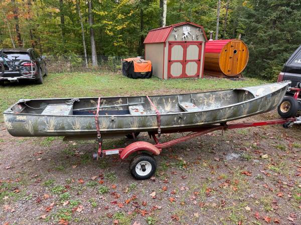 Duck hunters special. Grumman Sportboat mfg prior to 1972, Gator Trailer, and 1997 5hp Mariner motor with 3-gal external tank. The boat is a great shape, 15'3" long, 43" wide, weighs 122lbs, no leaks or lose rivets, no dents in hull, custom cattail camo paint, two oars, rated for 6hp, two sets of oar locks, custom canvas cover, and added a drain plug. Gator trailer is in good shape but cannot find any info about it. It does have a hinge point and looks like it was previously a flatbed converted to fit the Grumman with rollers and bunks. The 5ph mariner runs great, forward/reverse/neutral gear box, had the carb rebuilt too years ago, replaced the water pump 3 years ago, had a matching camo paint job to the boat. Offers considered.