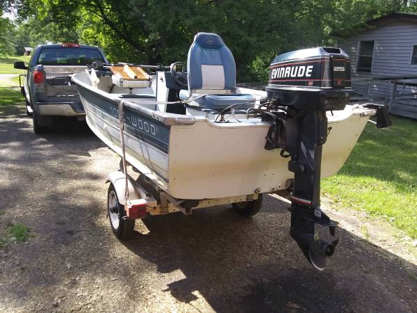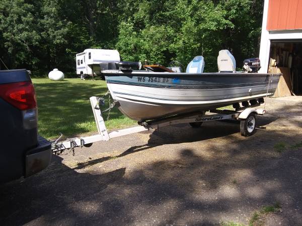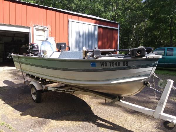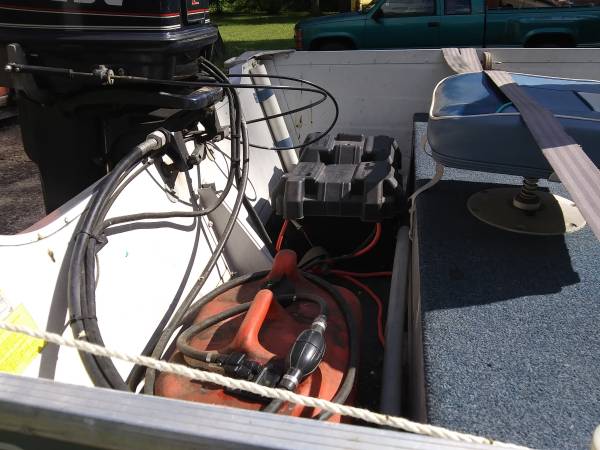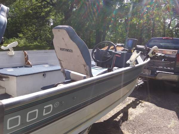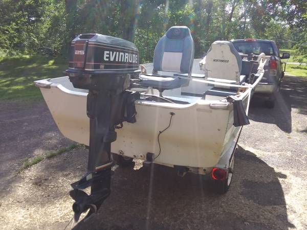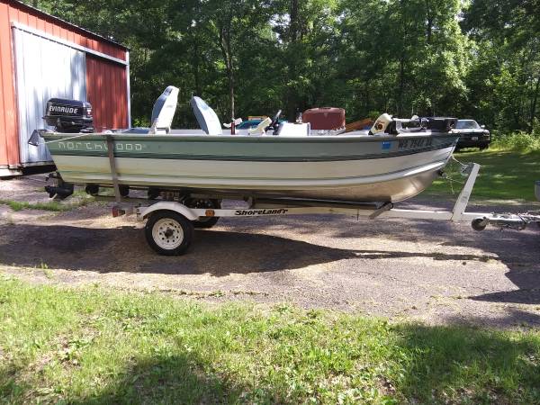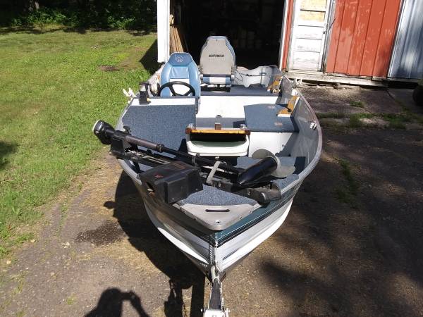 1994 14 ft northwood fishing boat--25 hp evenrude--console steering--electric start--bow mounted minnkota trolling motor /w foot controls--deck hand elec, anchor in front--anchor mate hand crank in back--2 batteries--live well--3 seats--carpeted floor--hummingbird fish finder--2 rod holders--shorelander trailer