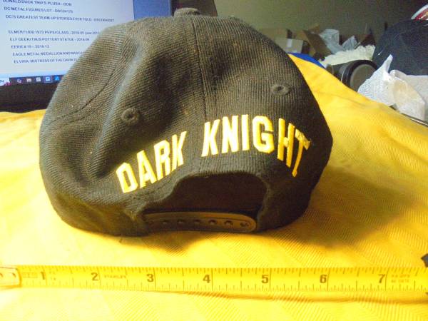 "DARK KNIGHT" in Yellow Letters is on the back of the Cap! This will fit any Adult sized head and is Brand New!! Similar Caps (used) are selling for up to $45.00 on other selling sites!