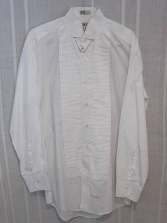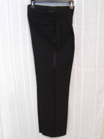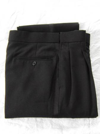 The jacket in size 36S is lined with no tears or stains, with a two-button front closure, several roomy inside pockets, and two false front pockets for a detailed look. Matching 30W tux pants, adjustable-waistband, comfort gore-elastic inserts for a great fit, easy-care wrinkle-free polyester material wipes clean. The slacks are currently hemmed to 29 inches but has a generous 7-inch inside turned-under-material so slacks could easily be shortened or lengthened with a quick hem-stitch with needle and black thread. Included is a Broadway Tuxmakers white pleated tuxedo long-sleeve button-down shirt in size Small 32/33 shirt (65% polyester, 35% cotton)for a finished look.