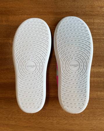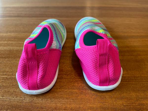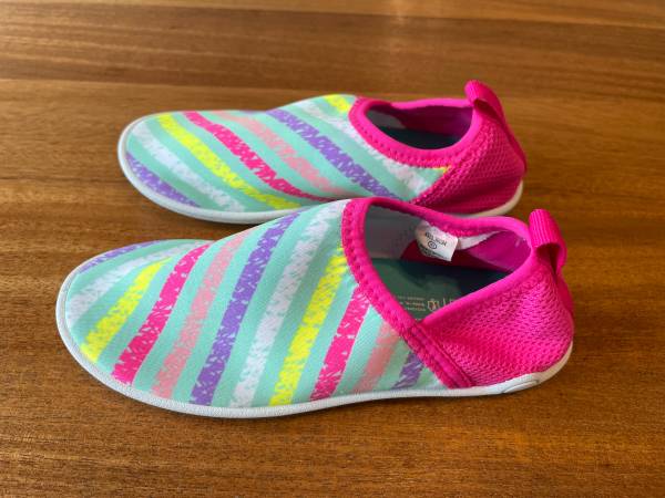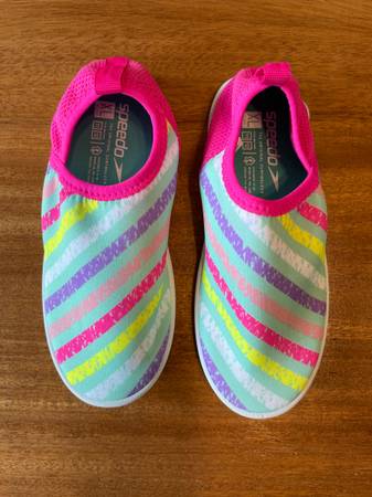 New without tags – great kids’ striped pool shoes by Speedo, from Target, in Little Kids size XL (11-12), typically age 4-6. Protects little feet and has UV protection. Great traction, lightweight, easy pull-on and off. Breathable 100% polyester upper, flexible outsole, machine washable, air dry. Originally $19.99 from Target. Smoke-free.