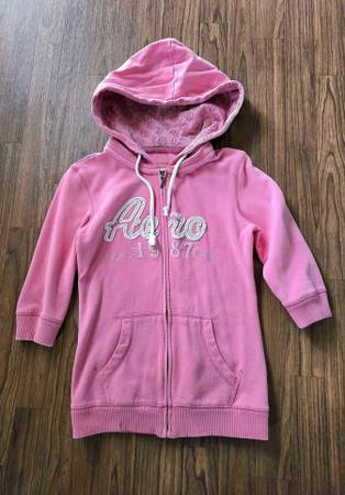 Pink 3/4 sleeve Aeropostale zip-up hoodie size S/P. There is a stain at the front lower right hem, and some fainter ones near the pocket. The ends of the hood string have some wear along with...