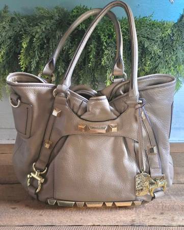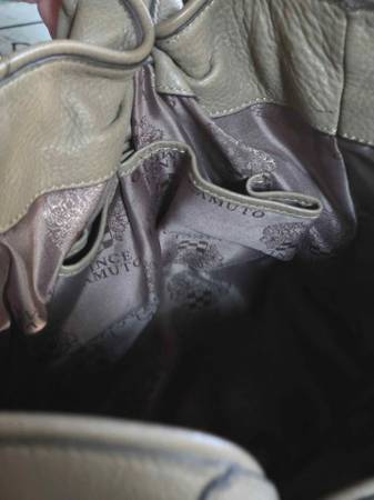 Price is firm. Large and heavier Vince Camuto brown leather purse with gold tone hardware. It is very spacious with one big main compartment, two interior side pockets, and one interior zip compartment. There are some small light cosmetic worn spots here and there such as at some edges and the underside of the handles. It measures 11.75" high from base to highest opening point, 14" wide from side to side with a 10" strap drop.