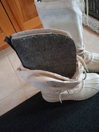 These are a great pair of women's boots for snowmobiling, fishing or any outdoor sport. I no longer wear these boots. ( I use to wear them for snowmobiling) They were very warm. They are sz. 7 and are 14 1/2" in height. No holes or rips. They have thick felt liners.