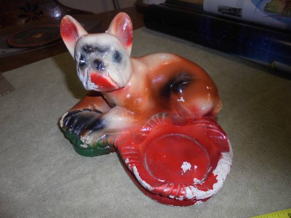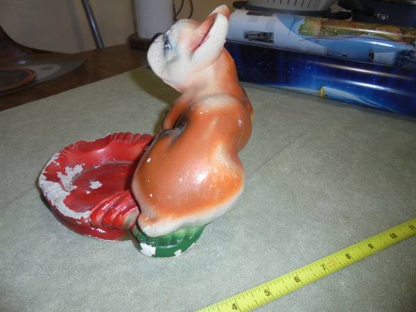 I recently bought a flat of these 1962 Carnival Chalk Figures from the original owner and each was created for and presented first at the at the 1962 Minnesota State Fair, then the 1962 Wisconsin State Fair, according to him!! These are all large, between 7" to 10" tall and do have some weight to them! This piece is a Pit Bull or Bulldog with a large Candy Dish attached!