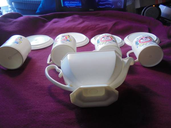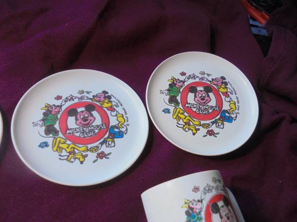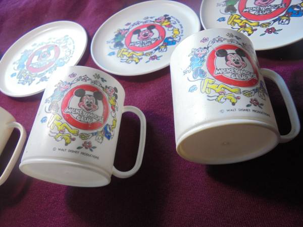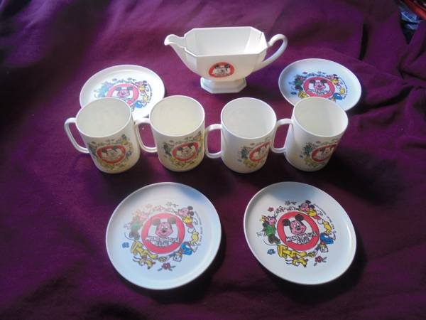 This set, sold in conjunction with the Mickey Mouse Club on Televeision in the 1950's, consists of 4 plastic cups, 4 plastic saucers and one plastic Tea Pot, all featuring the Mickey Mouse Club Logo with Mickey Mouse, Minnie Mouse, Pluto and Donald Duck on each!