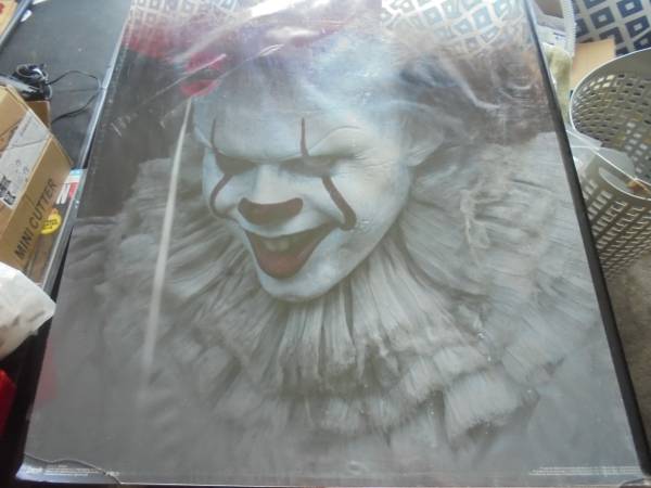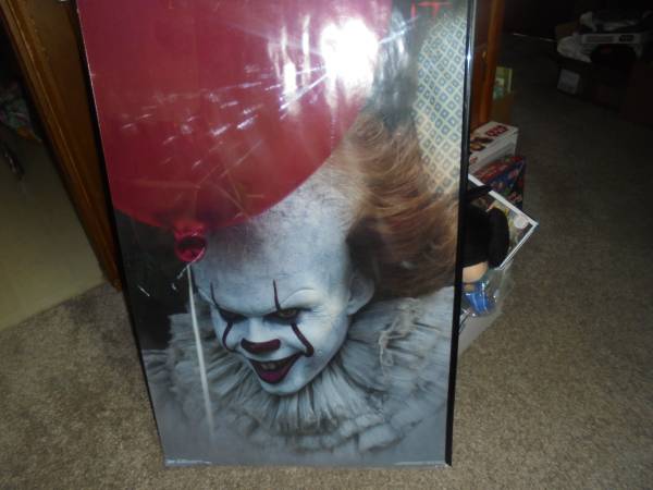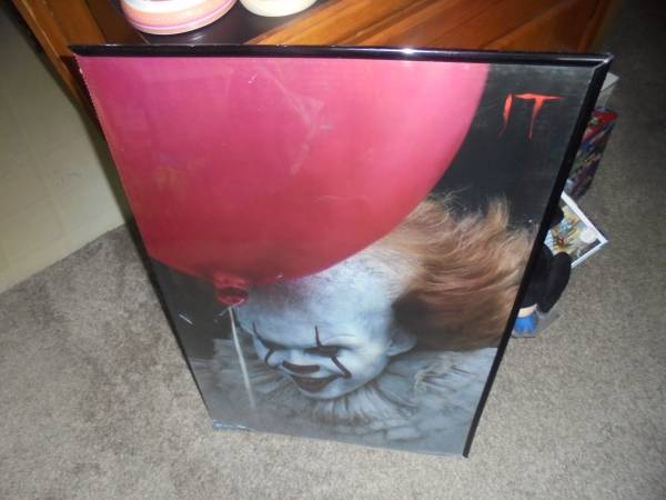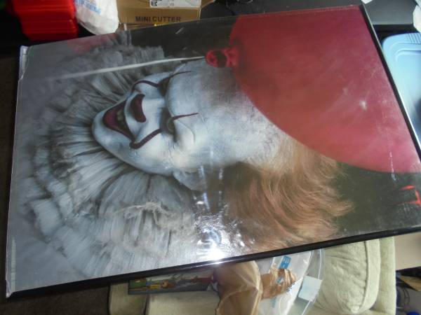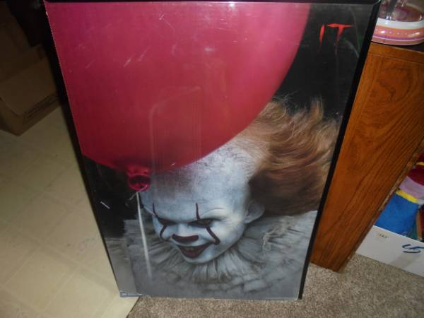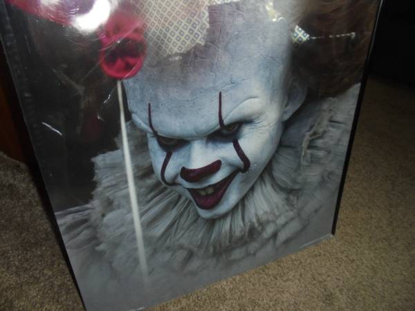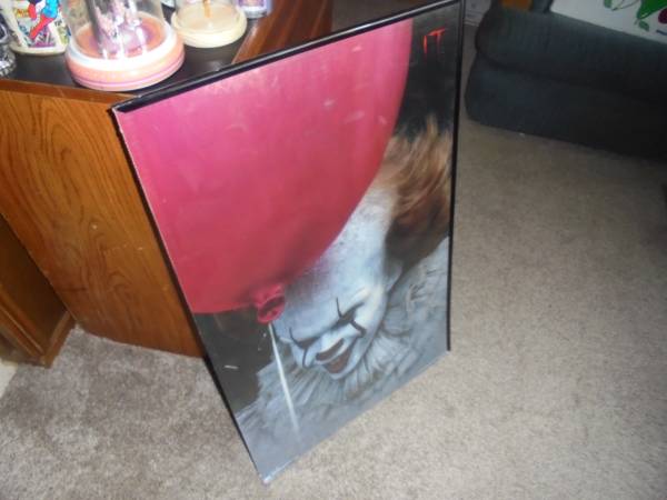 This Painted Horror Poster is in excellent condition: the graphics are clean and bright and the Poster overall is in incredible condition!! From the Stephen King Movie comes IT, in the guise of PENNYWISE THE CLOWN, to terrorize the children of Derry, Maine! This large 34" x 22 inches Poster features a stunningly realistic painting of Pennywise holding a Red Balloon! This will be shipped rolled...it's only in a frame for the pictures!