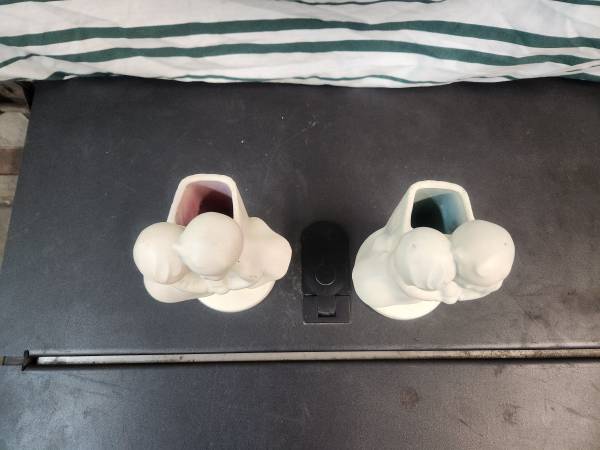 Asking $10 for both Vintage SHAWNEE POTTERY BOY AND GIRL Planter Flower Pot Figurines Vintage Cameron Clay Products boy & girl planter, white figural pottery, chubby little cuties leaning...