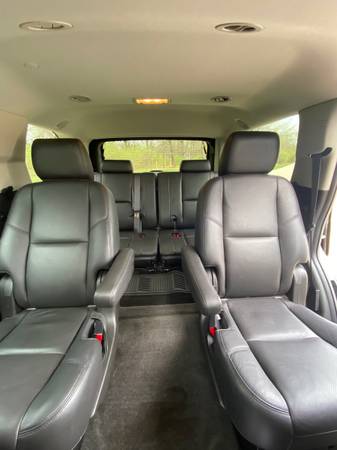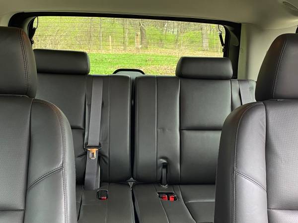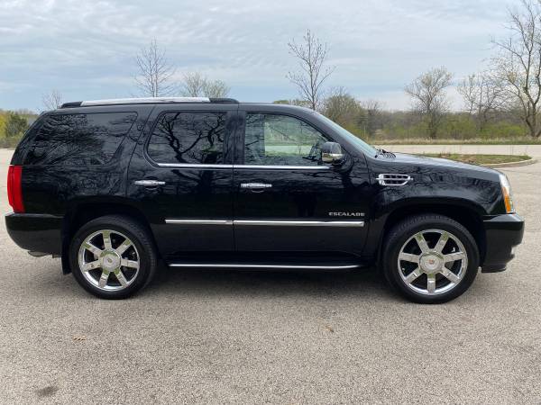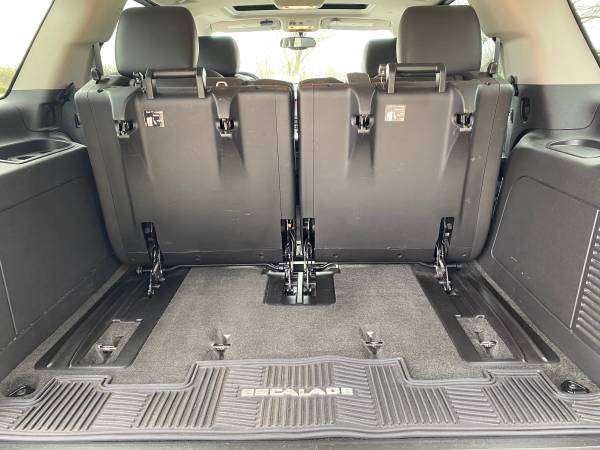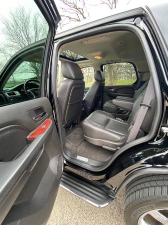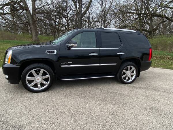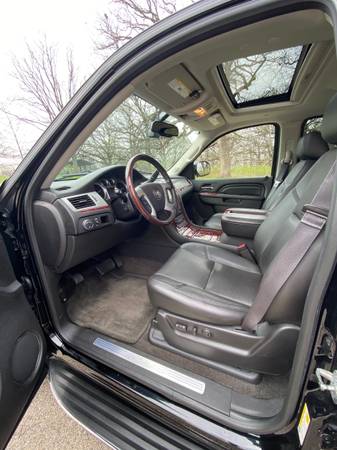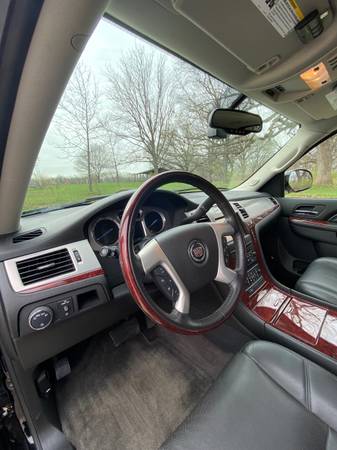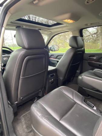 2013 Cadillac Escalade AWD Luxury. Super clean and Excellent condition. One owner. Heated garage kept. New Michelin tires. Professional mechanic maintained. Includes Weather Tech mats. Carpet is like new. Leather seats are in perfect shape. Third row seat was only used a few times. V8, 6.2 L, Flex Fuel; 6 speed automatic; navigation system; DVD-Audio with Single Disc CD; Bose 5.1 surround system; Bluetooth; USB Port; Heated steering wheel; Tri Zone Climate Control; Cruise control; Remote Start; Leather seats heated and cooled from and second row; 3-passenger 3rd row flips up for larger back area; Audio controls second row; power heated outside mirrors; Power sunroof; Wheels 22” chromed aluminum; Rear parking assist; Power lift gate; All airbags frontal, driver, and front passenger, side airbags, head curtain airbags; Rear vision camera; Trailering equipment; Top luggage racks. Black with black leather interior and mahogany trim.