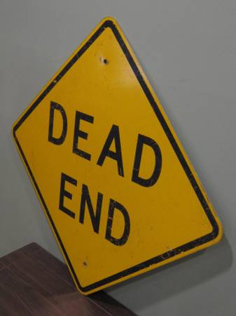 Authentic 24-inch x 24-inch steel road street sign - "DEAD END". This sign has been retired from service with wear. Measures 32.5-inch wide from diamond-shaped corner to corner. Yellow and white, one-sided, reflective, sturdy.
