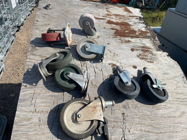 Used industrial casters many types and sizes to choose from. $9 each Price does not include tax. Accept check or cash. Pick up only. Pick up hours are M-Th 7:00-3:30 pm and Friday 7-11:30 am.