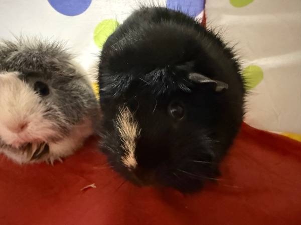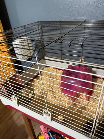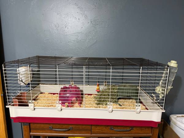 2 free female guinea pigs, come with whole set up. Cage, water bottles, food dishes, igloos. The white and gray piggie is about 4 years old and the black piggie is 3 1/2 years old. Any bedding/food/ Timothy hay I have left. They are very sweet, and are easy to handle. Just want them to go to a good home.