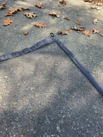 Black mesh pet gate that measures 31" high and 41.5" wide. One of the four loops was damaged and replaced. It will need hooks to hang (not included).