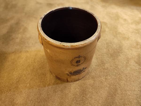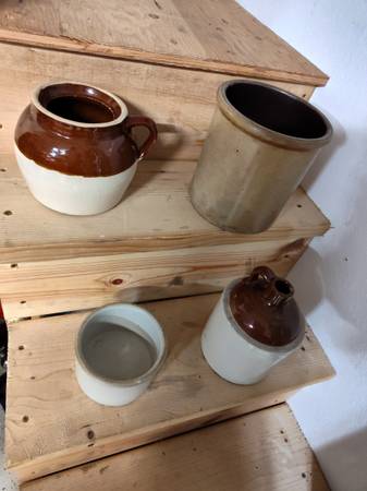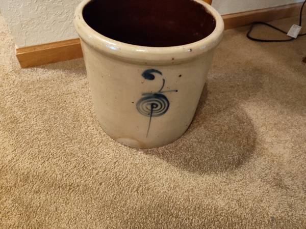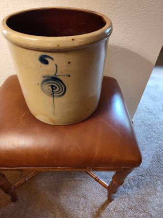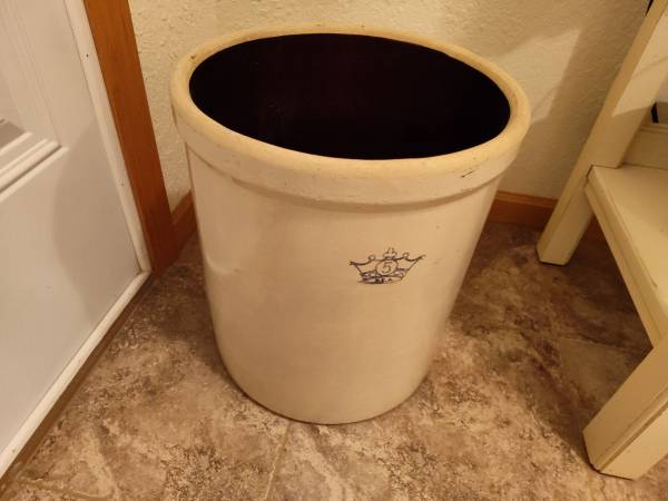 Variety of stone crocks in various sizes. 5 gallon. 6 gallon. The 2 gallon is a Red Wing. 250.00 for the lot.