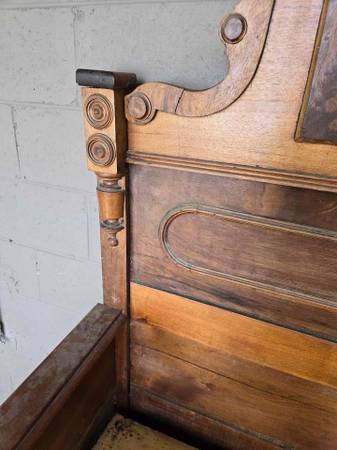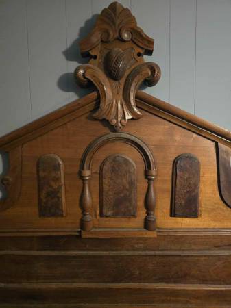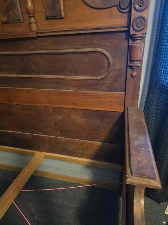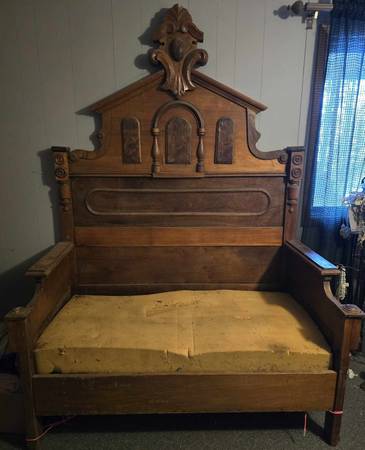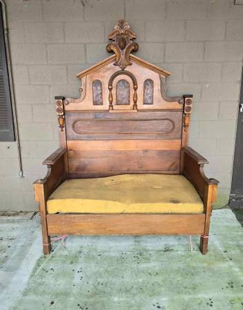 Price is firm. Gorgeous one of a kind large bench made from an antique wood headboard and footboard. The middle section where the cushion goes could use some slats and/or a board which would also help stabilize the bench as a whole. Right now there is only the middle board and some cords wrapped to keep the cushion up. The foam for the seat does have a lot of staining. With how old it is there are a few visible splits at the back piece (most of them are located on decorative pieces) and typical wear to the finish. Please see all pictures for close ups. This is one piece and does NOT come apart, and thus will need a truck or trailer to haul it, and help to load. It measures 80" high, 58.75 wide, and 29.75" deep.