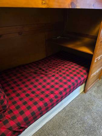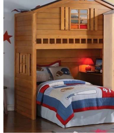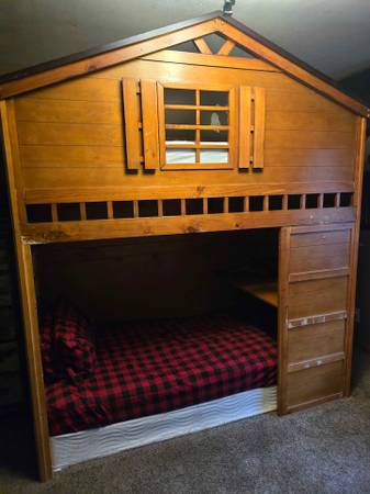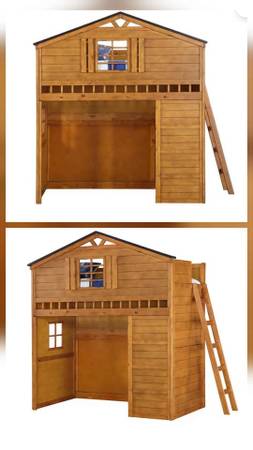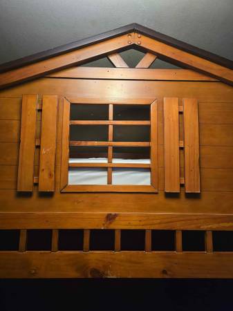 Price is firm. Rustic house sturdy loft bed. It features a twin on top with a center window and ladder to the right and another lower window to the left. The bottom section can either be used as a desk/play area or a twin bed can fit two different ways (as shown in the pictures) and still be used as a desk area. There is some wear to the finish in some places. The top bunk has a weight capacity of 165 pounds and does not require a box spring. No mattresses included. It measures 88" high, 80" wide, and 43" deep and has already been disassembled.
