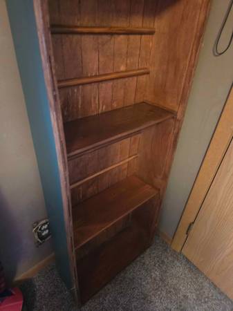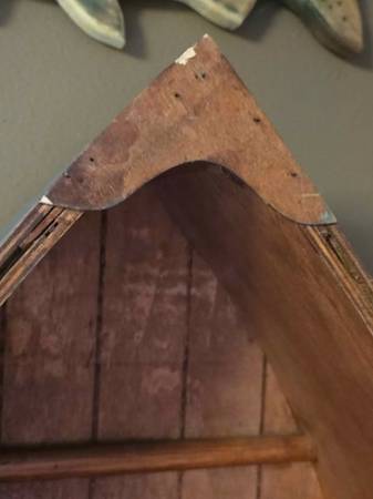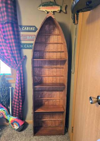 Price is firm. Rustic green lighter weight wood canoe/boat bookshelf. The bottom corner of one side could use another nail or two to tack it down better as shown in the close up. There are some minor cosmetic worn spots to the finish at sone edges. It measures 72" high, 20.5" wide, and 8" deep. The top three shelves are 6.75" deep.