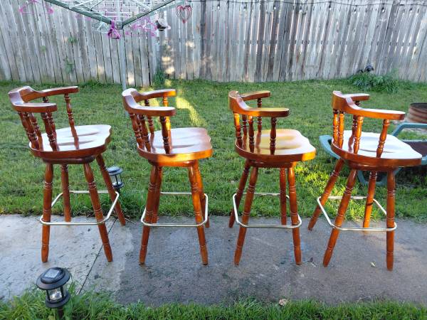 Four solid wood bar stools. Have a good heavy weight to them. Red-ish brown in color. All in good condition and rotation for all tops work well.