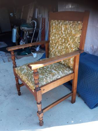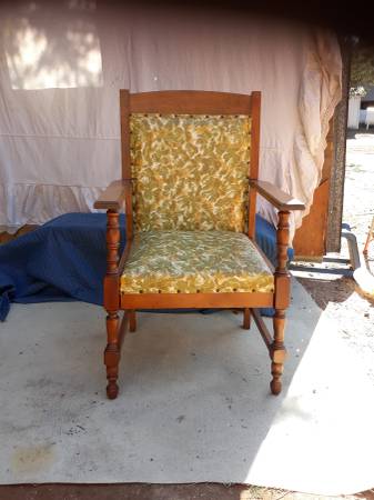 Elegant chair is vary sturdy and in nice shape. See pics. Can be easily reupholstered to fit any decor. Asking 75