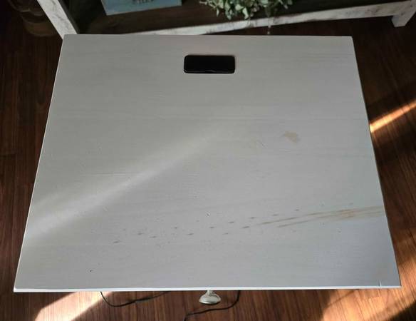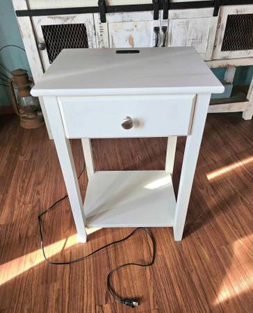 Price is firm. White pine wood nightstand featuring one working drawer and a four port USB charging station on top. There is one minor ding at the front top edge along with a couple other minor ones here and there, and some of the natural characteristics of the wood are visible on top (came this way). It measures 24.5" high, 17.25" wide, and 14" deep.