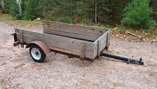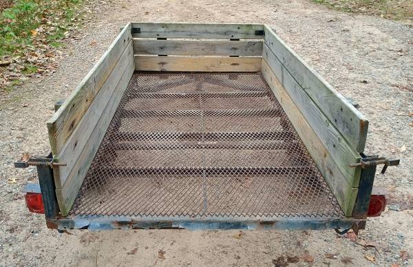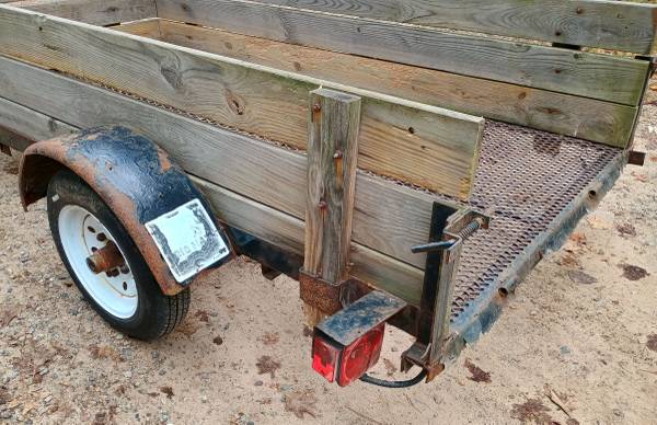 Big Max 4 foot wide by 8 feet long bed utility trailer for sale or trade. No ramp or jack, pulls and pushes well by hand since it's pretty light, turn signals work, nice tires are 4.80-12, trade for other trailers or anything with a motor, near Stella lake