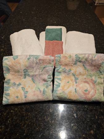 Nice bathroom towels consisting of: 4 white bath towels 2 colorful hand towels Seafoam Green and Rose washcloths All in nice condition from mom's rarely used guest bathroom. 8 pieces in all. From...