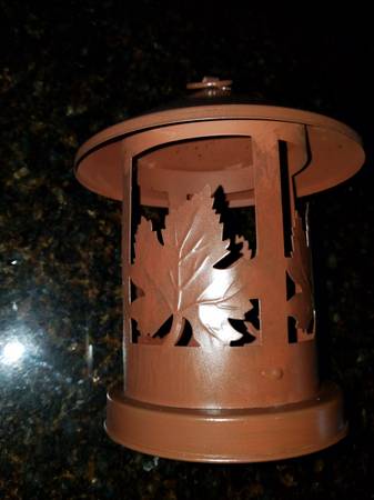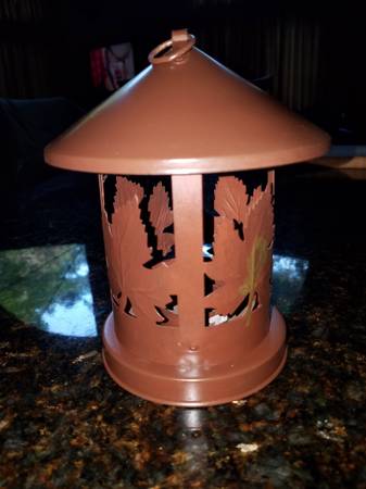 Here is a cute little metal lantern. Takes tea-lite candle or the same size battery candle. A tea-lite candle is included. Opens from the bottom. Has hanging ring on top. Use inside or out! Great in the garden as well.