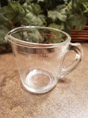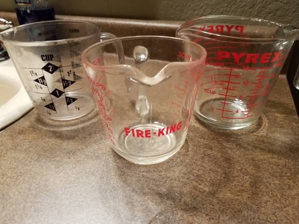 Different measuring cups available: Old Fire King 2 Cup Glass Measure from the 50's. D handle. Good condition - $12. Pyrex 2 cup Glass Measure. Good condition - $12. Good Cook metric hard plastic 2...