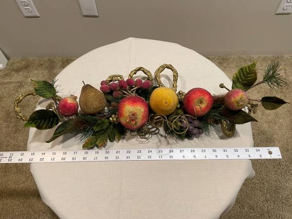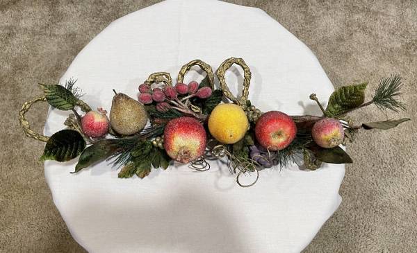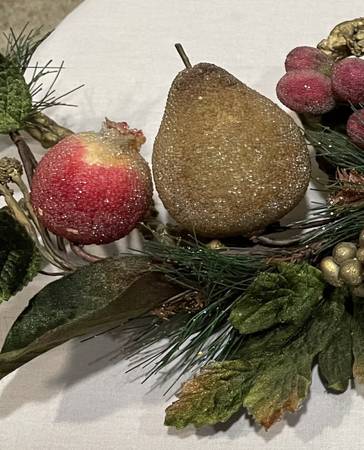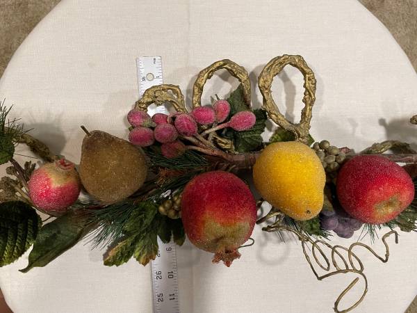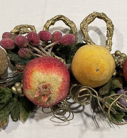 Beautiful beaded holiday fruit, berries, and foliage garland on a decorative gold twisted-twig-look base. Often used as a centerpiece for tables, a wall or door, a mantle, etc., common themes include autumn harvest and winter holiday decor. Features frosted-look crystallized fruits & berries with velveteen greenery all on a 24 -inch-long unique gold twisted base. Includes artificial apple, pears, pomegranate, grapes, and clusters of berries. The fruit and berries have a frosted or glittered finish. Measures 24" L x 9" H x 4.5" D. This piece is well made and holds together well. Enjoy as a wall hanging or swag for holiday or seasonal decorating. This garland swag makes a lovely statement for sure, with realistic sizes, and beaded fruit in very good condition. This special fruit garland is ready for you to adorn your home with. Clean, smoke-free.
