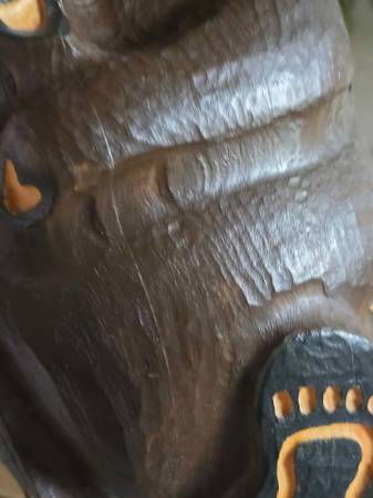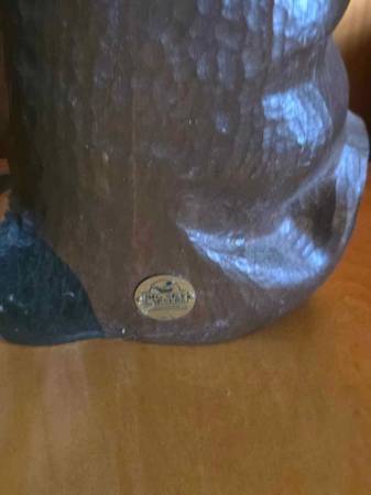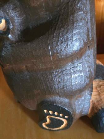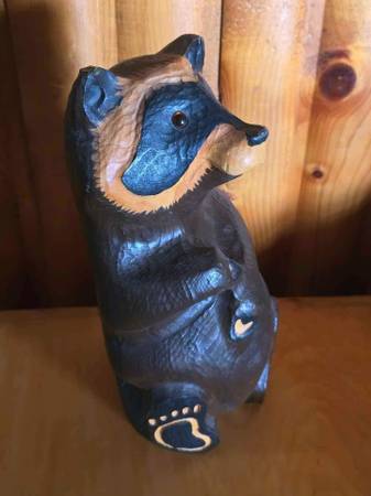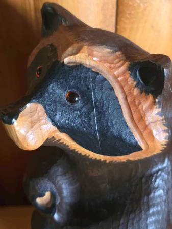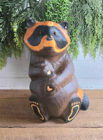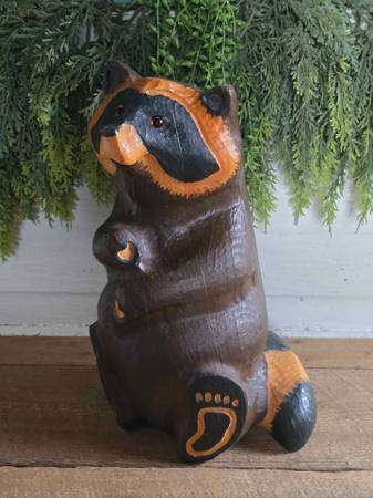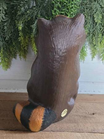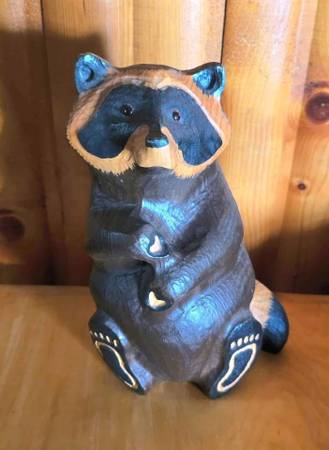 Price is firm. Retired vintage Big Sky Carvers Jeff Fleming pine wood carved "Emily" raccoon sculpture in the less common stained and painted combination vs. the only stained one. There are some natural lines from the wood that have always been there (not damage) such as at the face and running down the body. There are also some faint minor typical scuffs. It measures 12.5" high, 6.5" long, and 7.75" wide.