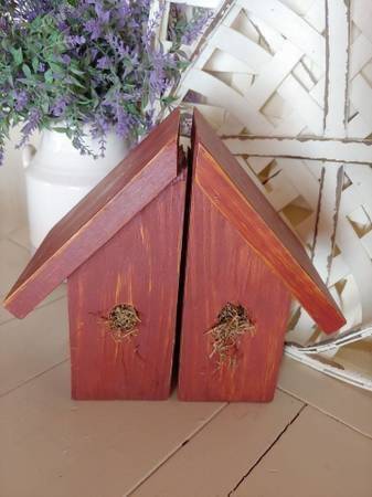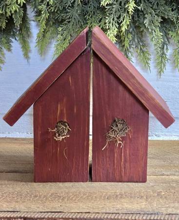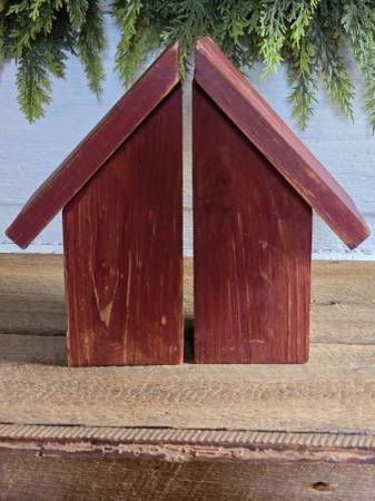 Set of primitive darker/duller shade of red distressed heavy wooden bookends. Each measures 9.5" high and 5" wide.