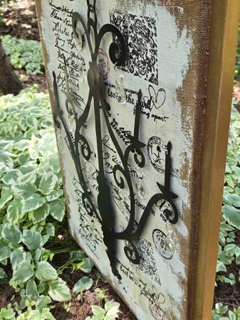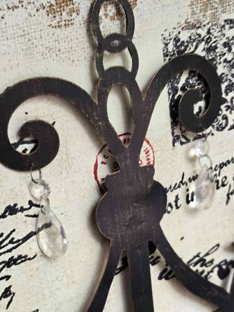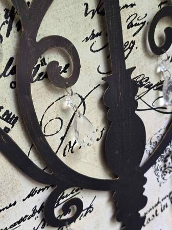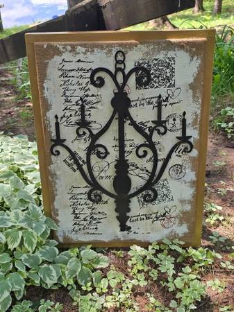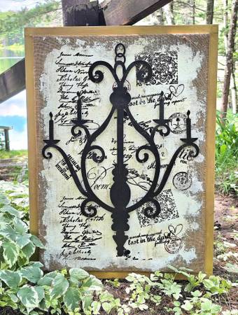 Price is firm. Beautiful wall hanging featuring a gold tone frame distressed burlap painted center with writing designed to look like post cards, and a distressed dark brown 3D chandelier cutout with dangling clear acrylic jewels. It measures 28" high and 20.5" wide.
