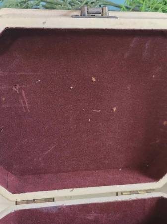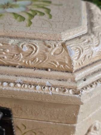 Price is firm. Shabby chic ornate cream flower chest storage box featuring dark red velvet lining, and ornate designs. It does have chipping to the finish in multiple places and some scratches to the interior's velvet. The exterior measures 10" high, 10.5" long, and 8.75" wide.