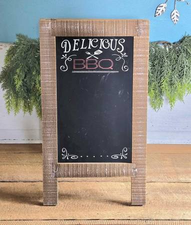 Rustic double sided "Delicious BBQ" chalkboard stand that can fold flat. It does have some scuffs and light surface scratches. It measures 18.5" high and 10.75" wide.