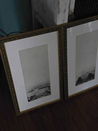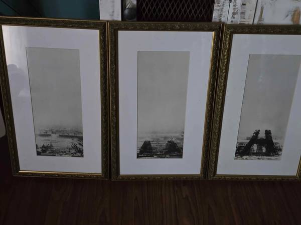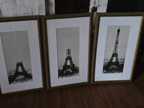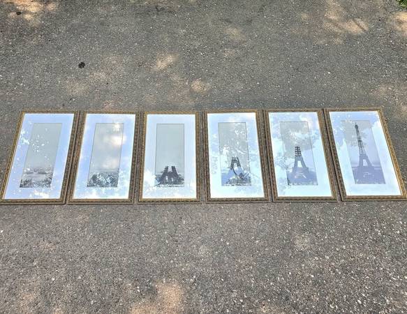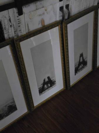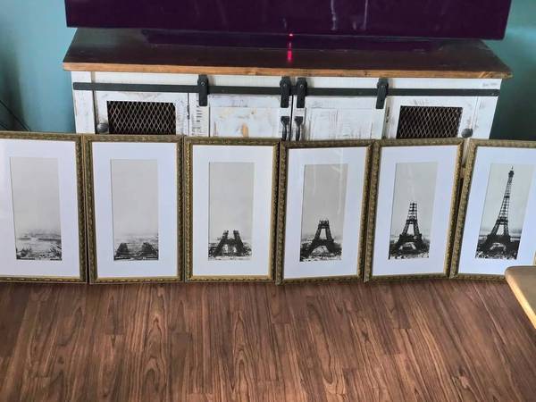 Price is firm. Set of six gold framed Ballard Designs black and white construction of the Eiffel Tower wall hangings. Each measures 20.75" high and 12.5" wide.
