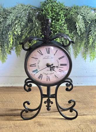 Battery operated Fleur de Lis clock. There is a scratch at the lower portion of the plastic face. One back leg is shorter than the other three and doesn't quite reach all the way down (still works fine with the three though). The bottom left side of the battery compartment is missing. The metal is still in place to hold the battery, and the clock does function fine as is. One decorative leaf has chipping to the paint as shown in the close-up. It measures 15.5" high and 8.5" wide.