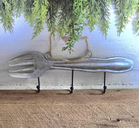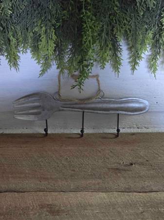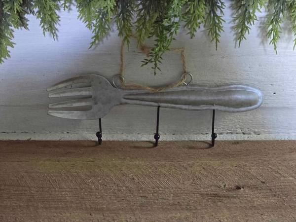 Primitive galvanized fork wall hook that measures 8.5" high with the jute to hang it and 11.75" wide.