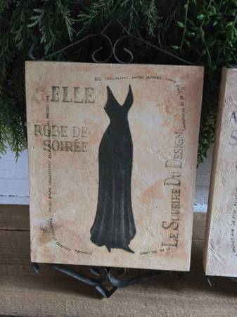 Price is firm. Will not separate. Set of two weathered French style ad wall hangings. The dress one measures 14" high and 8" wide and the umbrella is 13.75" high and 8" wide.