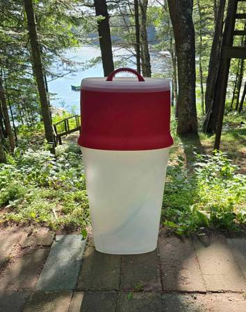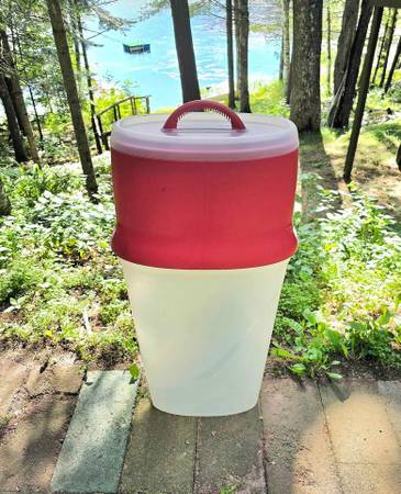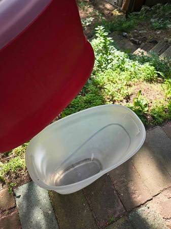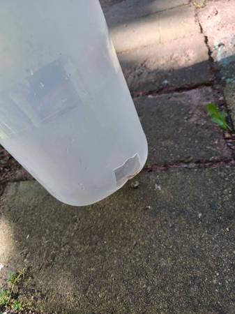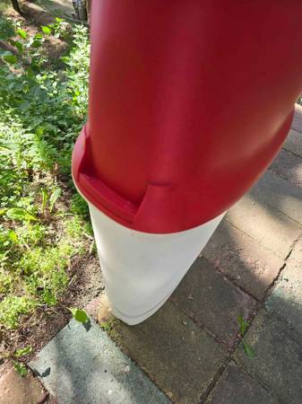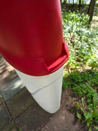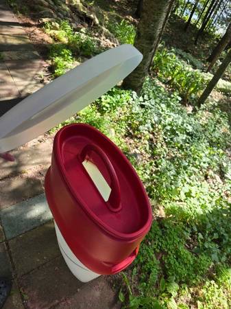 Homz gift wrap storage container. The lid is missing the two latches to connect it to the base. The handle has a split down the middle but was taped. The bottom also has a hole. Please see close...