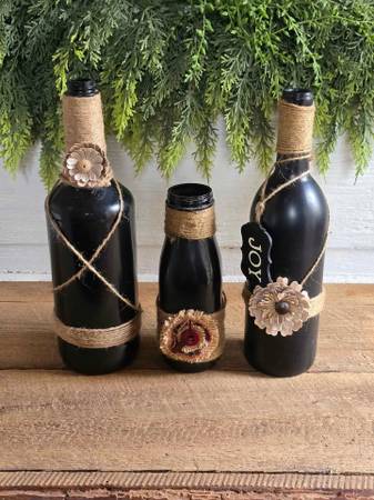 Set of three primitive black bottles decorated with jute, flowers, and a "Joy" tag. They measure 11.75", 11.25" and 7.5" high.